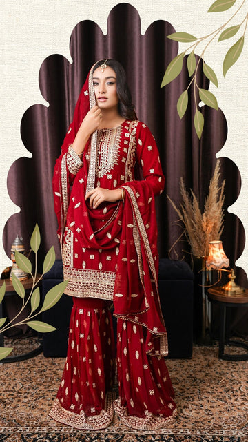 3 PIECE KURTI WITH SHARARA AND BEAUTIFUL DUPATTA WITH EMBROIDERY WORK